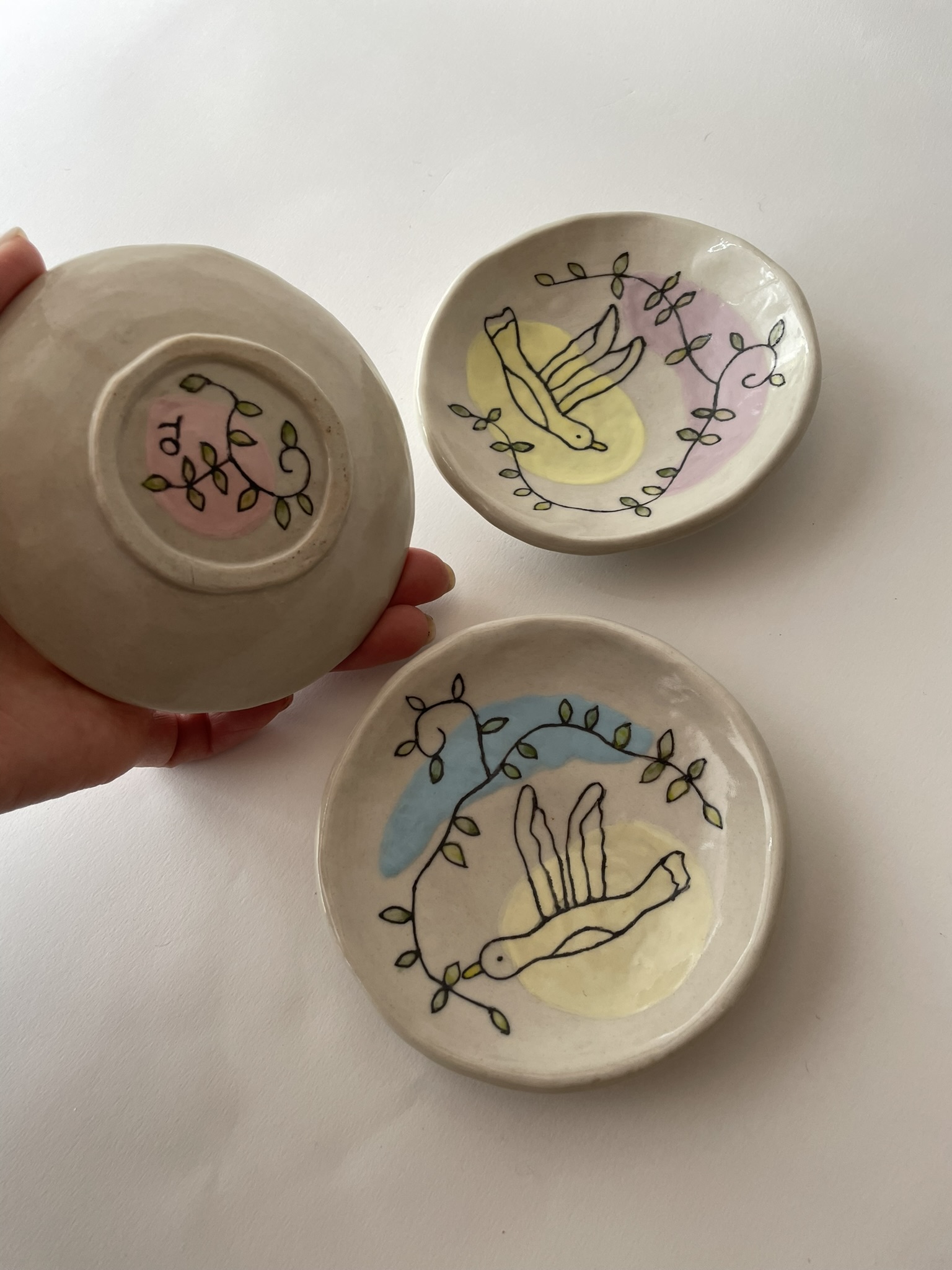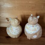 ぽってりとした丸いフォルムのねこを2体。胸のエプロンに言葉と花の絵を描きました。魚やネズミとも仲良しです。